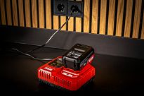 Ładowarka Power Delivery 45 W w zestawie z akumulatorem. Ładowarka przeznaczona do ładowania kompatybilnych akumulatorów SKIL z USB-C PWRASSIST™ w momencie gdy nie posiadamy standardowej ładowarki pod ręką. Ładowarką można również ładować urządzenia mobilne.