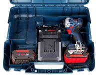 Zakrętarka udarowa GDR 18V-215 została wyposażona w 2 akumulatory litowo-jonowe 18V o bardzo dużej pojemności – 4,0Ah.