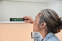 Poziomica emituje jasną, prostą linię laserową. Użytkownik ustawia ją na ścianie za pomocą praktycznego uchwytu lub przyklejanych punktów referencyjnych, a urządzenie wskazuje dokładne położenie poziomu lub pionu.