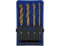 Spiralne wiertła tytanowe do drewna firmy DREMEL umożliwiają wiercenie w drewnie zachowując bardzo dużą precyzję. Stożek centrujący, w jaki jest wyposażone, chowa się w drewnie niczym śruba umożliwiając wiercenie bez konieczności punktowania.