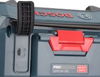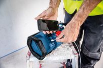Wbudowane gniazdo do zasilania akumulatorowego pozwala na korzystanie z radia bez konieczności podłączania do zasilania sieciowego 220V/230V – radio może być zasilane tylko i wyłącznie akumulatorami litowo-jonowych 18V firmy BOSCH z linii Professional.