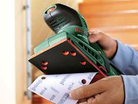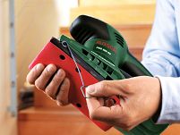 Dzięki dużym i łatwym w obsłudze metalowym zaciskom oraz płycie szlifierskiej wyposażonej w rzep możliwe jest stosowanie wszelkiego rodzaju papierów ściernych – dostępne na rynku papiery w arkuszach oraz papiery z rzepem. Montaż taki gwarantuje szybki i łatwy sposób wymiany papierów ściernych, a przy tym obniża koszt wykonanej pracy. Wystarczy odchylić zacisk i zdjąć zużyty papier, po czym założyć nowy papier, zacisnąć zacisk i można dalej kontynuować szlifowanie.
