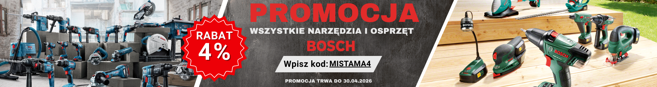 Promocja obejmuje wybrane produkty marki BOSCH z kategorii osprzęt oraz elektronarzędzia dostępne w ofercie sklepu.